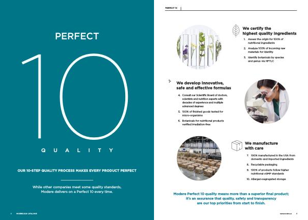Modere Perfect 10 quality means more than a superior final product ; it ’ s an assurance that quality , safety and transparency are our top priorities from start to finish . www . modere . ca 9